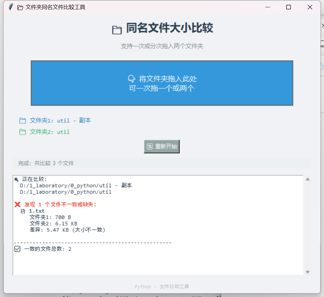 compare_folders()- 比对两个文件夹的文件大小 - 拖拽处理: