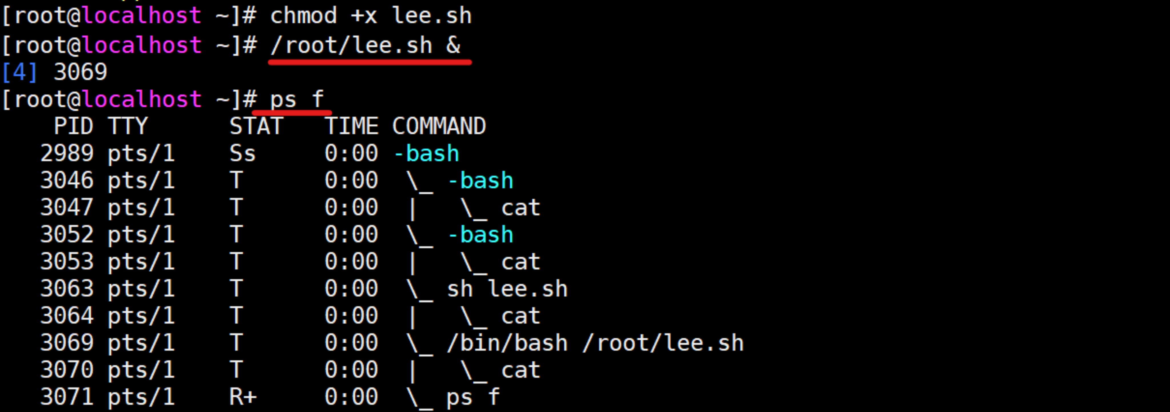 方法2:/root/lee.sh &。需要开启可执行权限,才可通过绝对路径的方式调用脚本。