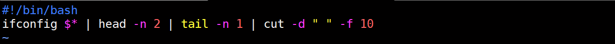 | 执行 ifconfig 命令并传递所有参数($*) | 取前两行输出 | 从这两行中取最后一行 | 按空格分割,提取第 10 个字段 |