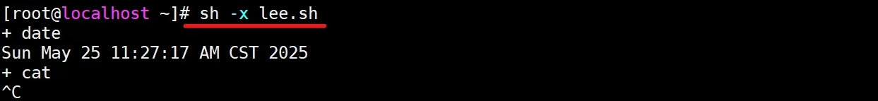 sh -x lee.sh:显示执行过程:显示执行过程的详细信息,+ 行表示命令,不带 + 的行表示命令的输出。可清楚地知道是 cat 命令的输出出现问题。
