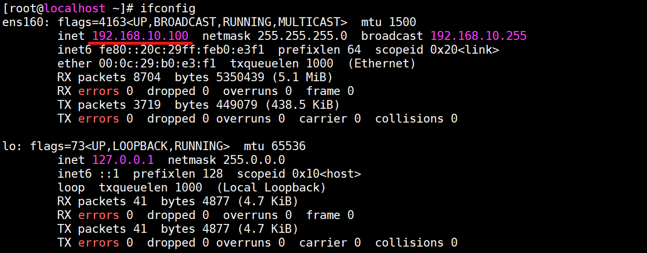 在 ifconfig 中,通过脚本只显示 ens160 的 ip 地址(192.168.10.100)。
