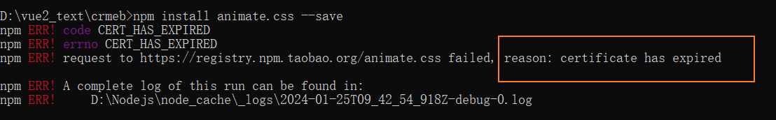 vue中加载动画库----执行指令npm install animate.css --save时报错:npm ERR! request to https://registry.npm.taobao.org/animate.css failed, reason: certificate has expired