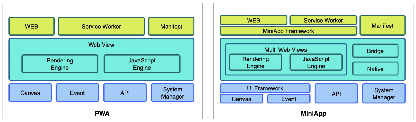 2、小程序和PWA的架构:MiniApps 的目的不是要取代渐进式 Web 应用程序 (PWA)、本机应用程序或 Web。而是各有千秋,至于适用的场景,开发者在理解差异之后可以根据场景的不同来进行技术选型。