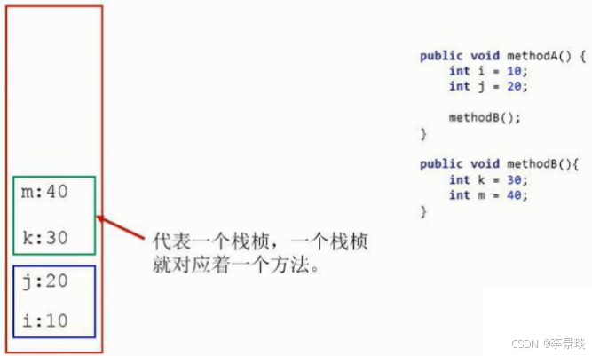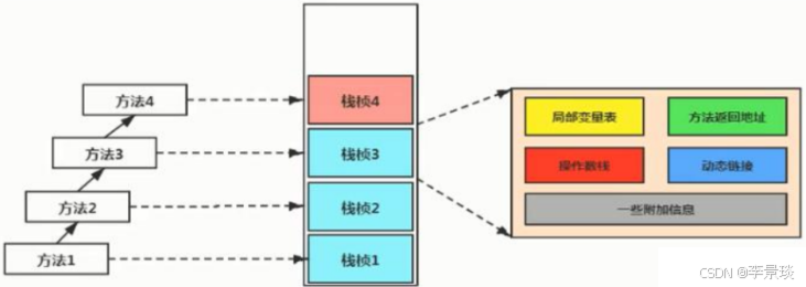 - 如果在该方法中调用了其他方法,对应的新的栈帧就会被创建出来,放在栈的顶端,成为新的当前栈帧。