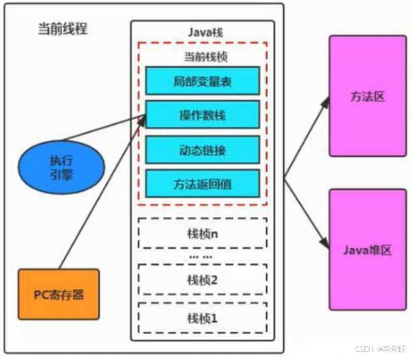 - JVM 直接对 java 栈的操作只有两个:调用方法,进栈. 执行结束后出栈.