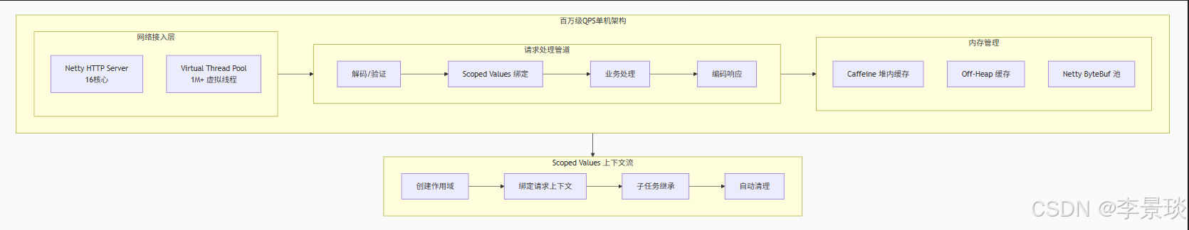 | 百万级 QPS | 单数据中心内的极致优化 | 垂直扩展极限、单点瓶颈,单机资源极限,线程调度开销 | 极致本地化、线程模型优化、内存零拷贝,虚拟线程池,Scoped Values,值对象 |