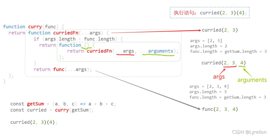 function curry(func) { return function curriedFn(...args) { // 判断形参和实参的个数 if (args.length < func.length) { return function () { // 将...args与...arguments拼接传递给curriedFn return curriedFn(...args, ...arguments); }; } return func(...args); }; } function getSum(a, b, c) { return a + b + c; } const curried = curry(getSum); console.log(curried(2, 3)(4)); // 9 console.log(curried(2)(3, 4)); // 9