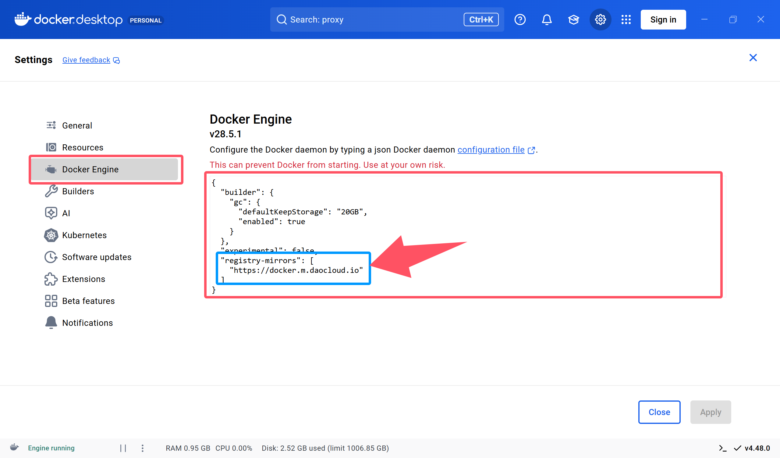 2、在docker desktop中设置国内代理,具体方式如图。