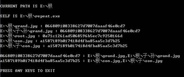 (3) 程序自动遍历当前文件夹及其子文件夹下的所有,逐一读取文件的“指纹”信息并记录 /RESULT/md5.his,同一“指纹”的多个文件的路径信息将以行的形式写入 /RESULT/record.log ;