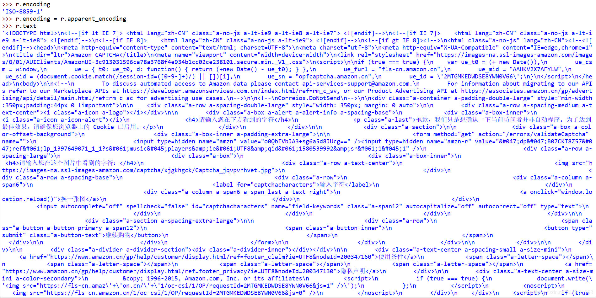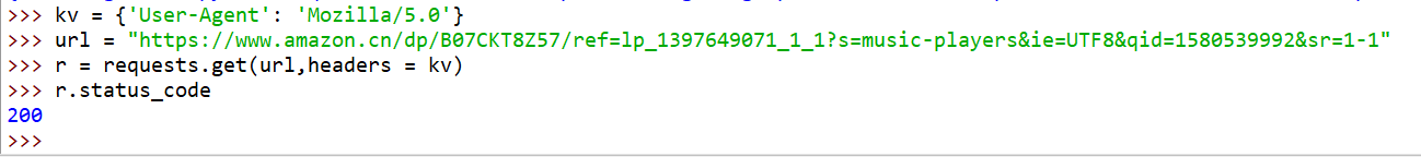 >>> r = requests.get("https://www.amazon.cn/dp/B07CKT8Z57/ref=lp_1397649071_1_1?s=music-players&ie=UTF8&qid=1580539992&sr=1-1")