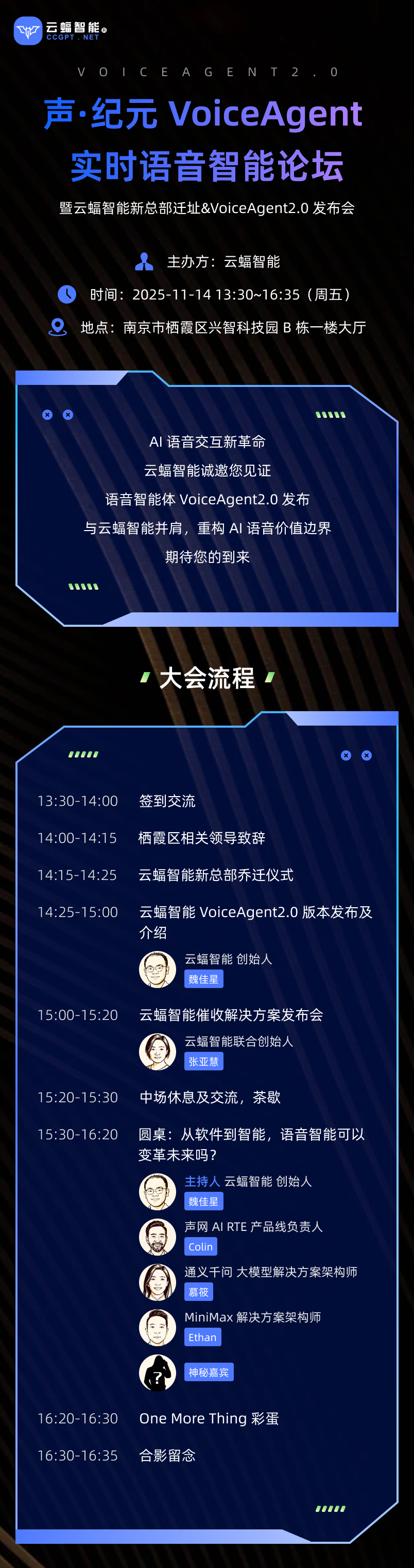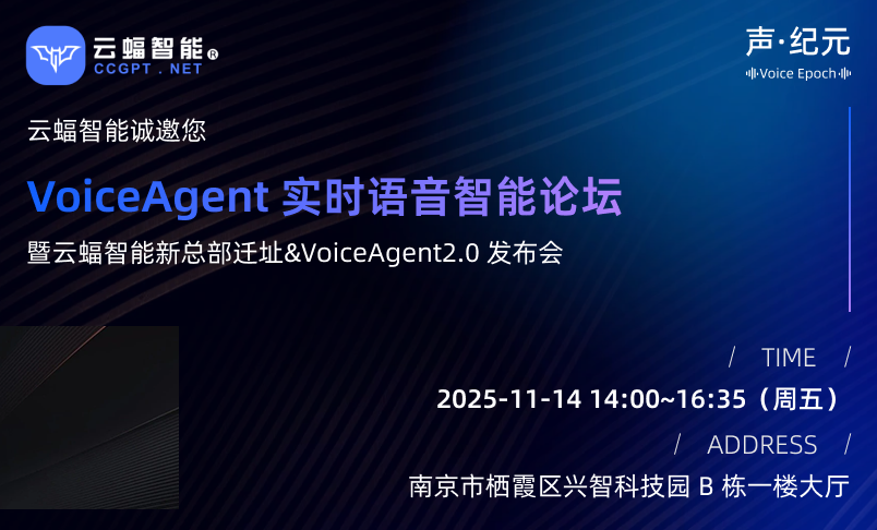 2025年11月14日(周五)下午,由云蝠智能主办的「声·纪元」VoiceAgent 实时语音智能论坛将在南京市栖霞区兴智科技园 B 栋一楼大厅正式举行。本次论坛以“AI 语音交互新革命”为主题,聚焦语音智能体的技术演进与行业应用,旨在与行业伙伴共同探索语音智能的未来路径
