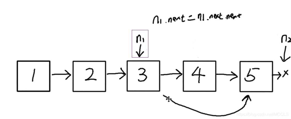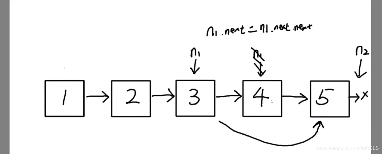 对于图链表来说就是中间从隔一个节点变成隔两个节点,最后用n1.next=n1.next.next进行删除节点操作