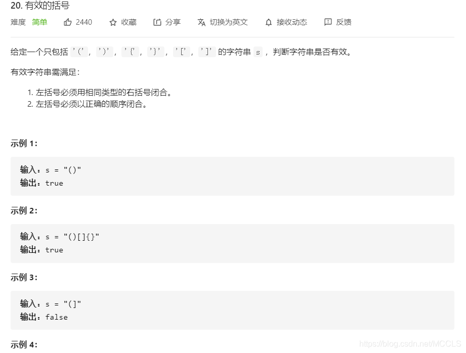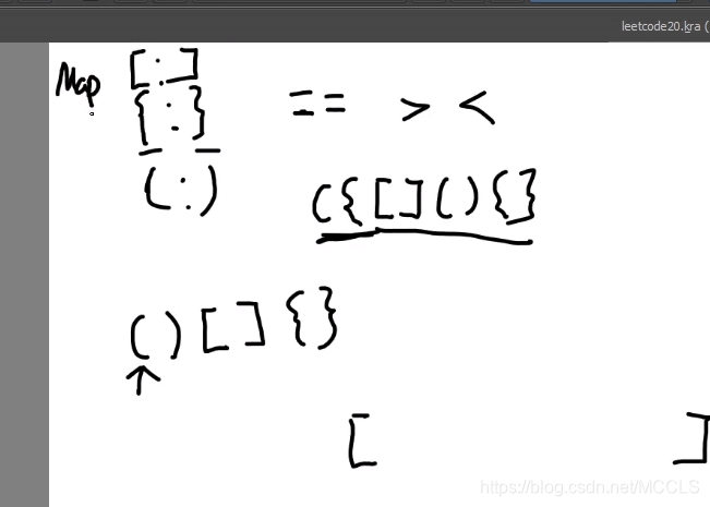 1.例子遍历数组第一个为左括号,通过‘(‘与map中key值进行比较,发现匹配,则把对应map中的值')',push到stack里{)};