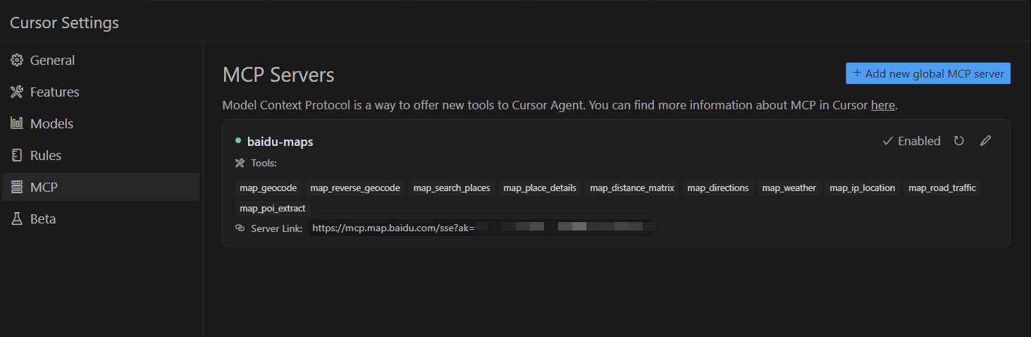 { "mcpServers": { "baidu-maps": { "url": "https://mcp.map.baidu.com/sse?ak=您的AK" } } } -