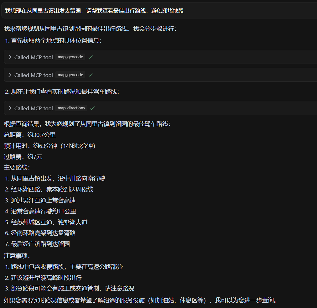 例如:我想现在从同里古镇出发去留园,请帮我查看最佳出行路线,避免拥堵地段