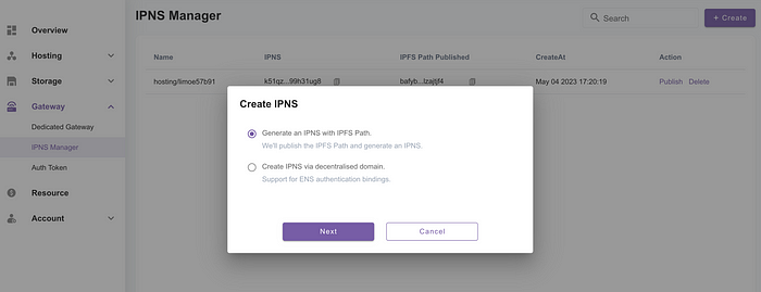 通过访问控制面板左侧的网关选项卡,您可以找到IPNS Manager功能。