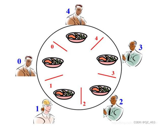 例题1:下列图所示的经典的哲学家进餐场景有可能出现死锁,能够预防死锁的方法有:最多允许4个哲学家同时进餐、仅当一个哲学家左右两边筷子都可用时才允许他拿筷子、奇数号哲学家先拿左边的筷子,偶数号哲学家先拿右边的筷子、给其中某一个哲学家增配1只筷子