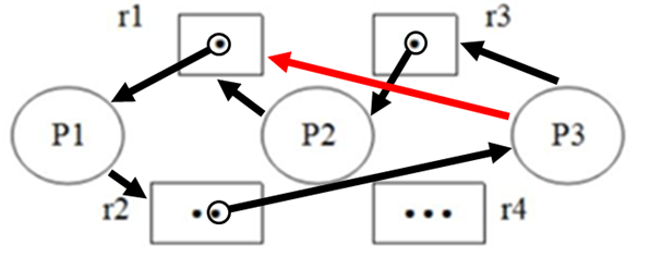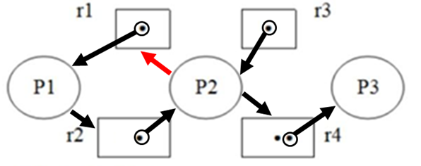 例题2:某计算机系统中共有3个进程P1、P2、P3,4类资源r1、r2、r3、r4,其中r1、r2、r3每类资源只有1个,r4资源有2个,当前的资源分配状态如下:E={<r1,P1>,<P2,r4>,<r3,P2>,<r2,P2>,<r4,P3>,<P1,r2>},若进程P2申请一个r1类资源,则系统可能会发生死锁现象