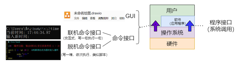 - 操作系统提供的接口包括:命令接口(命令行界面)、程序接口、图形界面接口(图形用户界面)