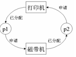 例题2:下列图所示的进程资源分配图表示出现了死锁,采用方法进程p1先申请打印机,再申请磁带机;p2暂停可以预防死锁的发生