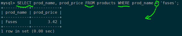 SELECT prod_name, prod_price FROM products WHERE prod_name = 'fuses';