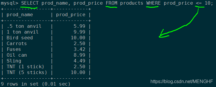 SELECT prod_name, prod_price FROM products WHERE prod_price <= 10;