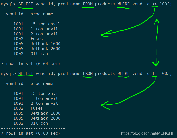 SELECT vend_id, prod_name FROM products WHERE vend_id <> 1003;