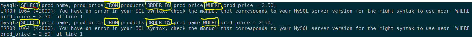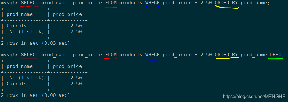 需要特别注意的是,WHERE 和 ORDER BY 一起使用时,使用顺序为 WHERE ===> ORDER BY ,否则会出现报错;