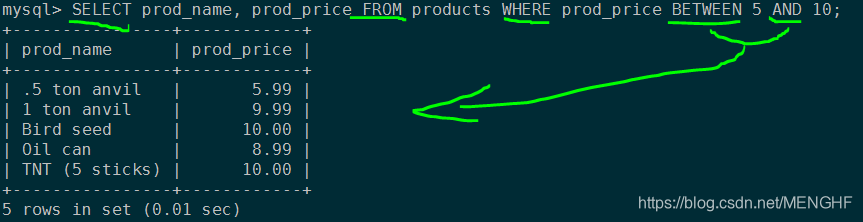 SELECT prod_name, prod_price FROM products WHERE prod_price BETWEEN 5 AND 10;