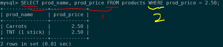 SELECT prod_name, prod_price FROM products WHERE prod_price = 2.50;