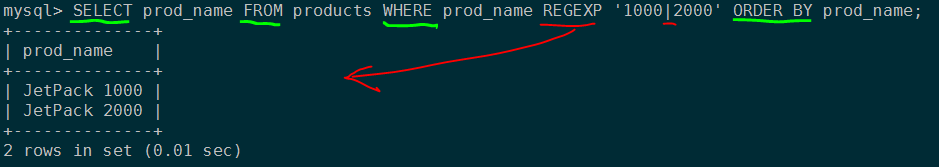 SELECT prod_name FROM products WHERE prod_name REGEXP '1000|2000' ORDER BY prod_name;