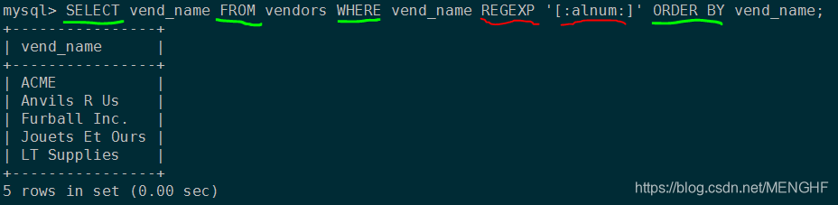 SELECT vend_name FROM vendors WHERE vend_name REGEXP '[:alnum:]' ORDER BY vend_name;