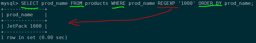 SELECT prod_name FROM products WHERE prod_name REGEXP '1000' ORDER BY prod_name;