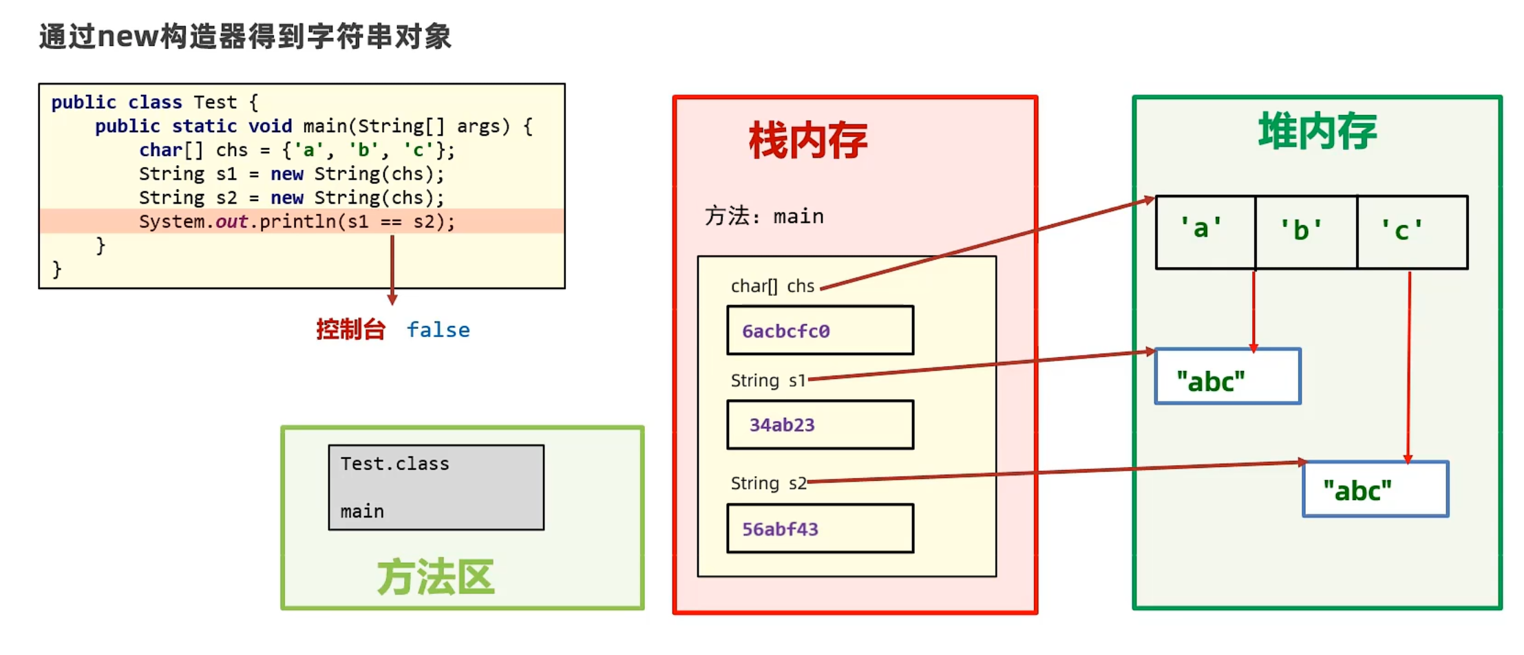 因此,s1指向直接存储在堆内存中的abc对象,s2则指向字符串常量池中的abc,地址不同,不相等。
