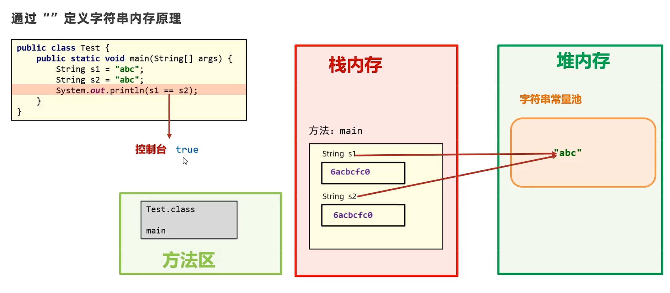 双引号直接创建的字符串对象(例如"abc"),而非直接创建的字符串对象计算的结果直接放在堆内存中(例如"ab"+"c"形成的"abc"对象直接存储在堆内存中)