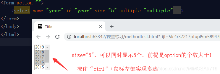 多选:当type属性为checkbox时,name属性的值,可以取同一个值,也可以是不同的值,区别是后台处理数据的方式变化。一般建议采用相同的值。