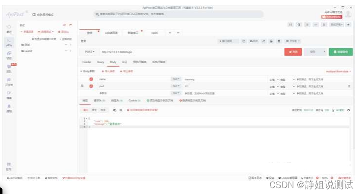 另一种就是通过工具进行接口测试,一般又postman、jmeter、apipost.我一般使用的是apipost,它是一款国产的接口测试工具,使用起来简单方便.能够很快掌握使用它进行接口测试.