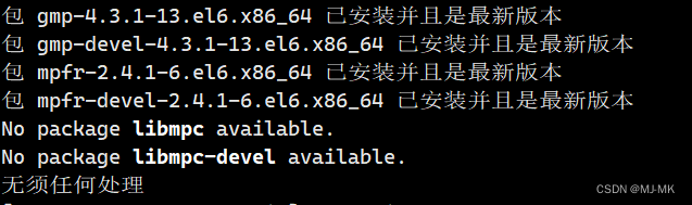 在尝试使用yum更新并安装libmpc时,用户成功执行了更新yum并安装EPel-release的步骤。然而,过程中遇到了libmpc安装的错误,可能阻碍了进一步的系统或软件配置。