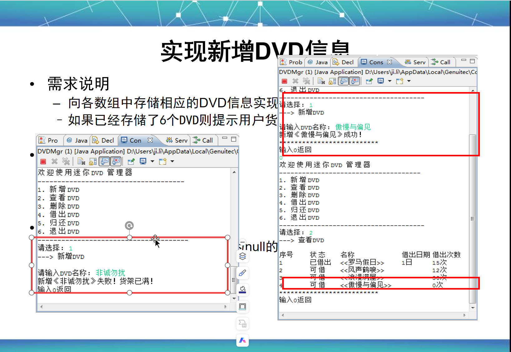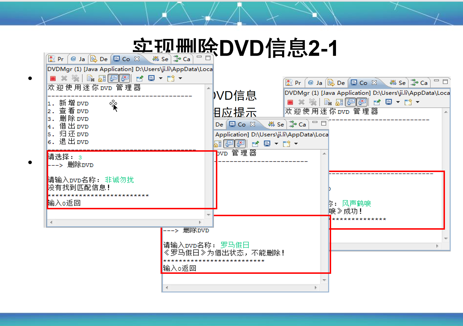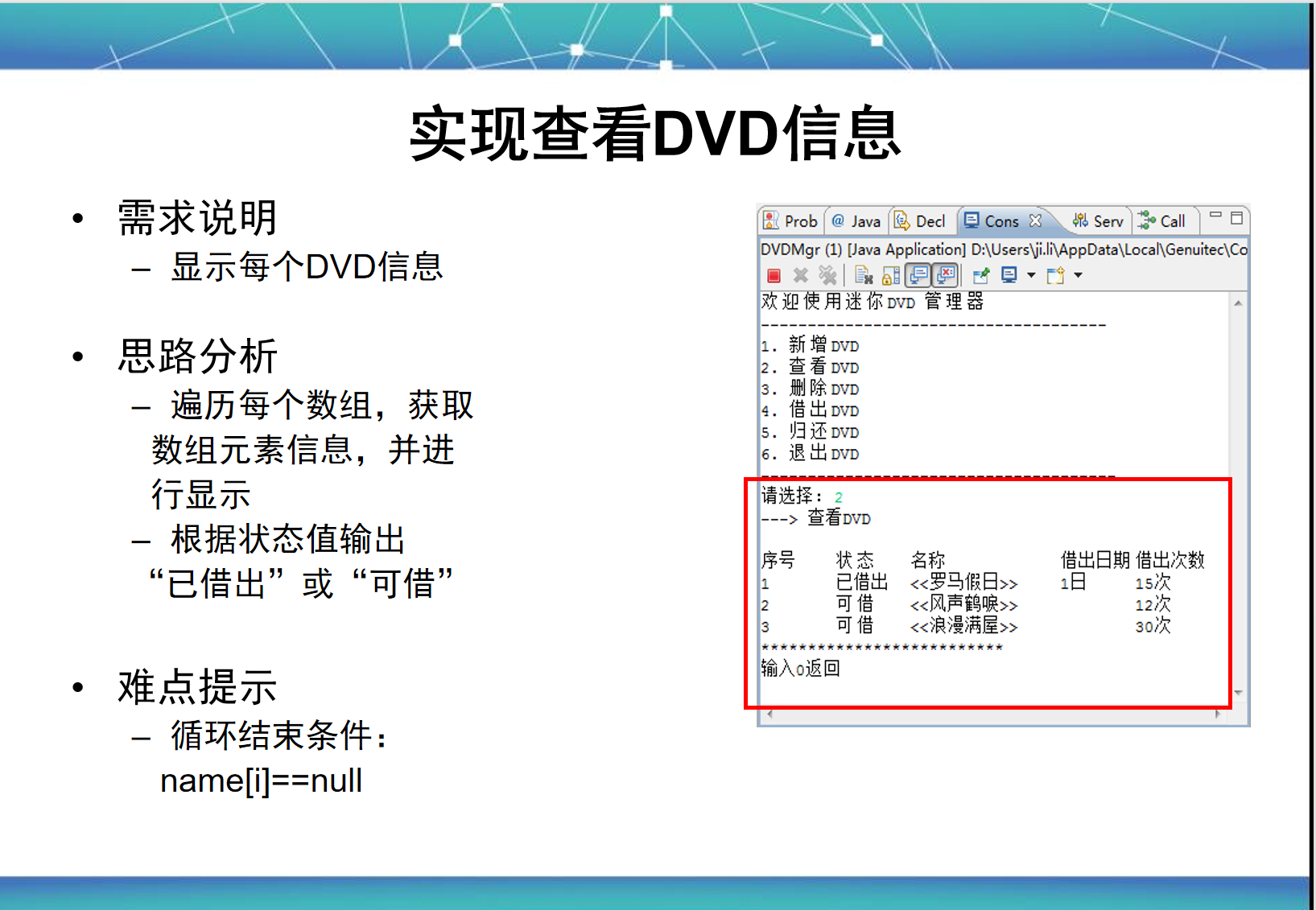 ReturnDVD(returnName); // 返回操作的成功信息在其内部已打印
