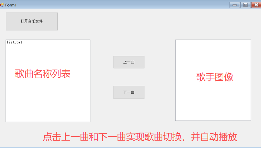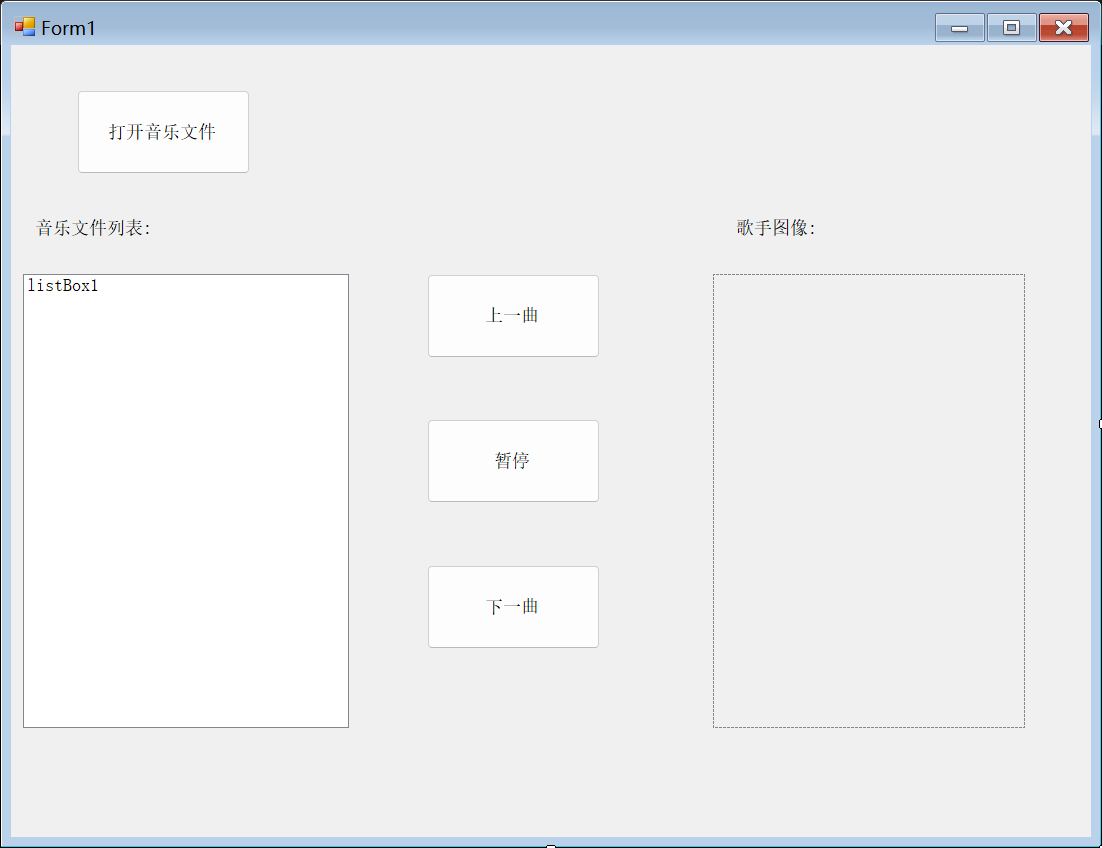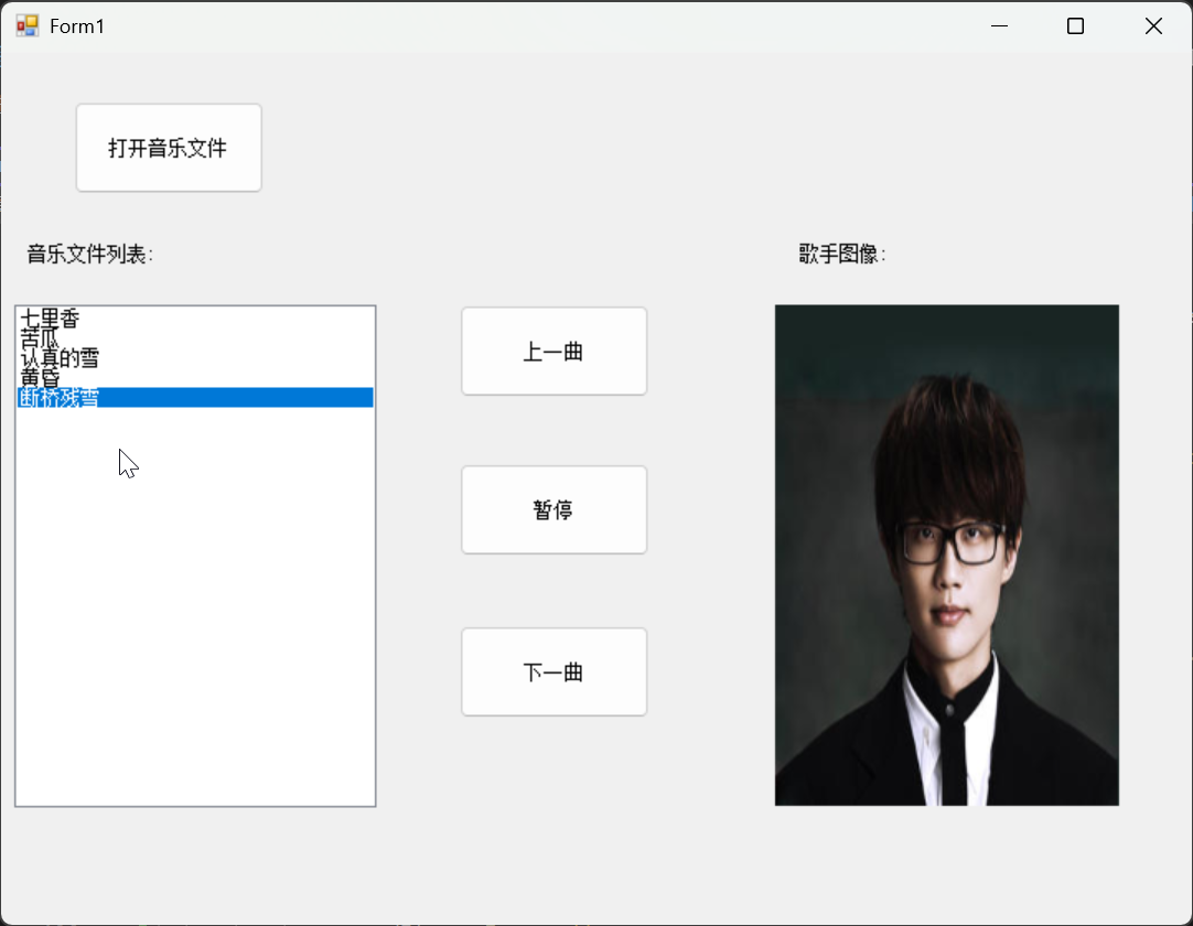 2. 当选择后音乐文件名称添加到ListBox列表框中,双击歌曲名称实现音乐播放,同时在右侧展示对应的歌手图像