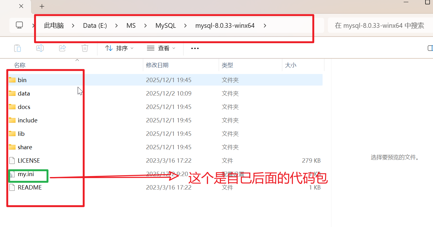 3.创建一个my.ini文件然后将下面的代码粘贴上去,并放到mysql-8.0.33-win64文件夹的根目录中