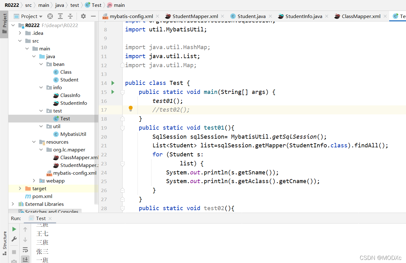 public class Student { private int sid; private String sname; private int sage; private String ssex; private Class aclass; private int cid; public int getCid() { return cid; } public void setCid(int cid) { this.cid = cid; } public int getSid() { return sid; } public void setSid(int sid) { this.sid = sid; } public String getSname() { return sname; } public void setSname(String sname) { this.sname = sname; } public int getSage() { return sage; } public void setSage(int sage) { this.sage = sage; } public String getSsex() { return ssex; } public void setSsex(String ssex) { this.ssex = ssex; } public Class getAclass() { return aclass; } public void setAclass(Class aclass) { this.aclass = aclass; } public Student(){ } public Student(int sid, String sname, int sage, String ssex, Class aclass, int cid) { this.sid = sid; this.sname = sname; this.sage = sage; this.ssex = ssex; this.aclass = aclass; this.cid = cid; } }Mybatis总配置jdbc