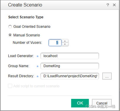 说明:目标场景设计就是定义要实现的【测试目标】,LR会根据根据这些目标自动构建场景。(测试目标:LR提供了5中目标-虚拟用户数、每秒单击次数、每秒事务数、每分钟页面数、事务响应时间)