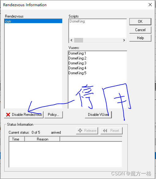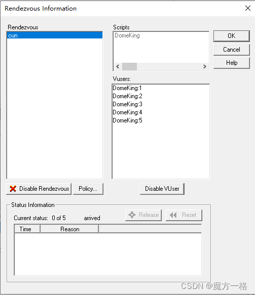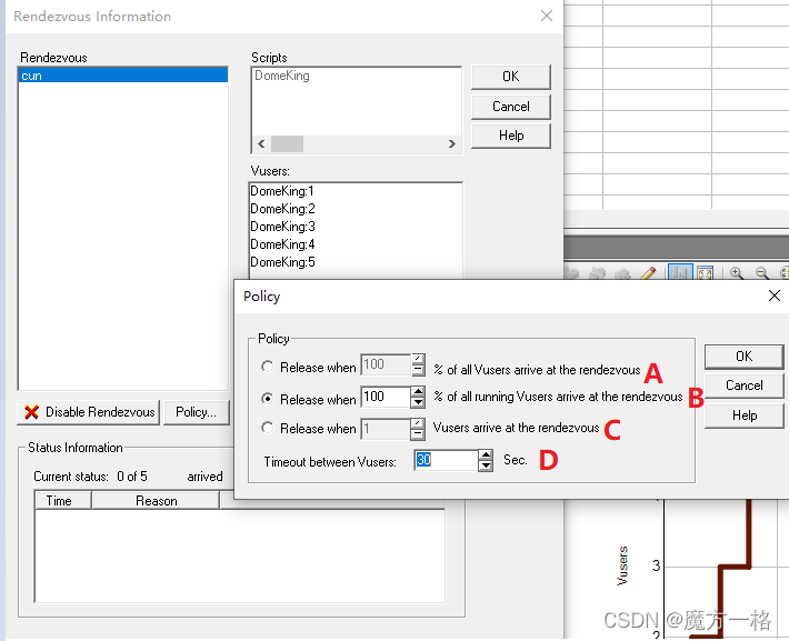 B:当所有正在运行的虚拟用户中的x %到达集合点时释放,即仅当场景中指定百分比的、正在运行的虚拟用户到达集合点时,才释放虚拟用户,因为等待时间的原因存在因为用户还没启动无法参与集合点。
