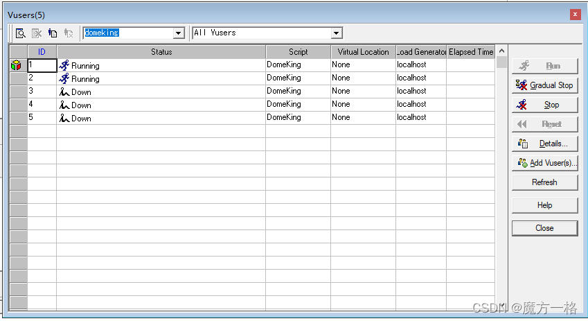 Number of Vusers :设置虚拟用户数量(我们设5个开开胃)完了点击OK,会自动启动
