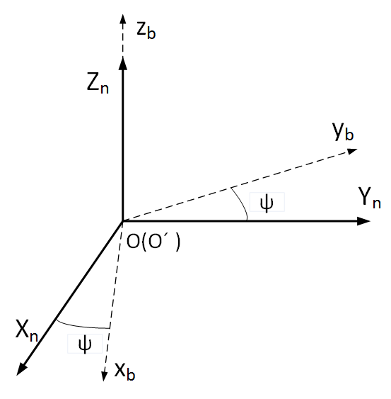 是经过加速度计校正后的矩阵,当某个确定的向量(b系中)经过这个矩阵旋转之后(到n系),这两个坐标系在XOY平面上重合,只是在Z轴旋转上会存在一个偏航角的误差。下图表示的是经过
