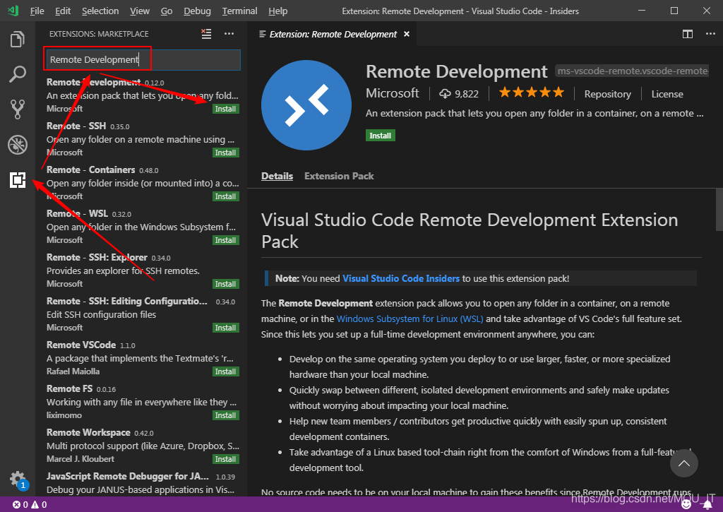 安装好VSCode之后,代开软件,点击扩展栏,然后搜索”Remote Development”,第一个就是了,然后点击Install安装。