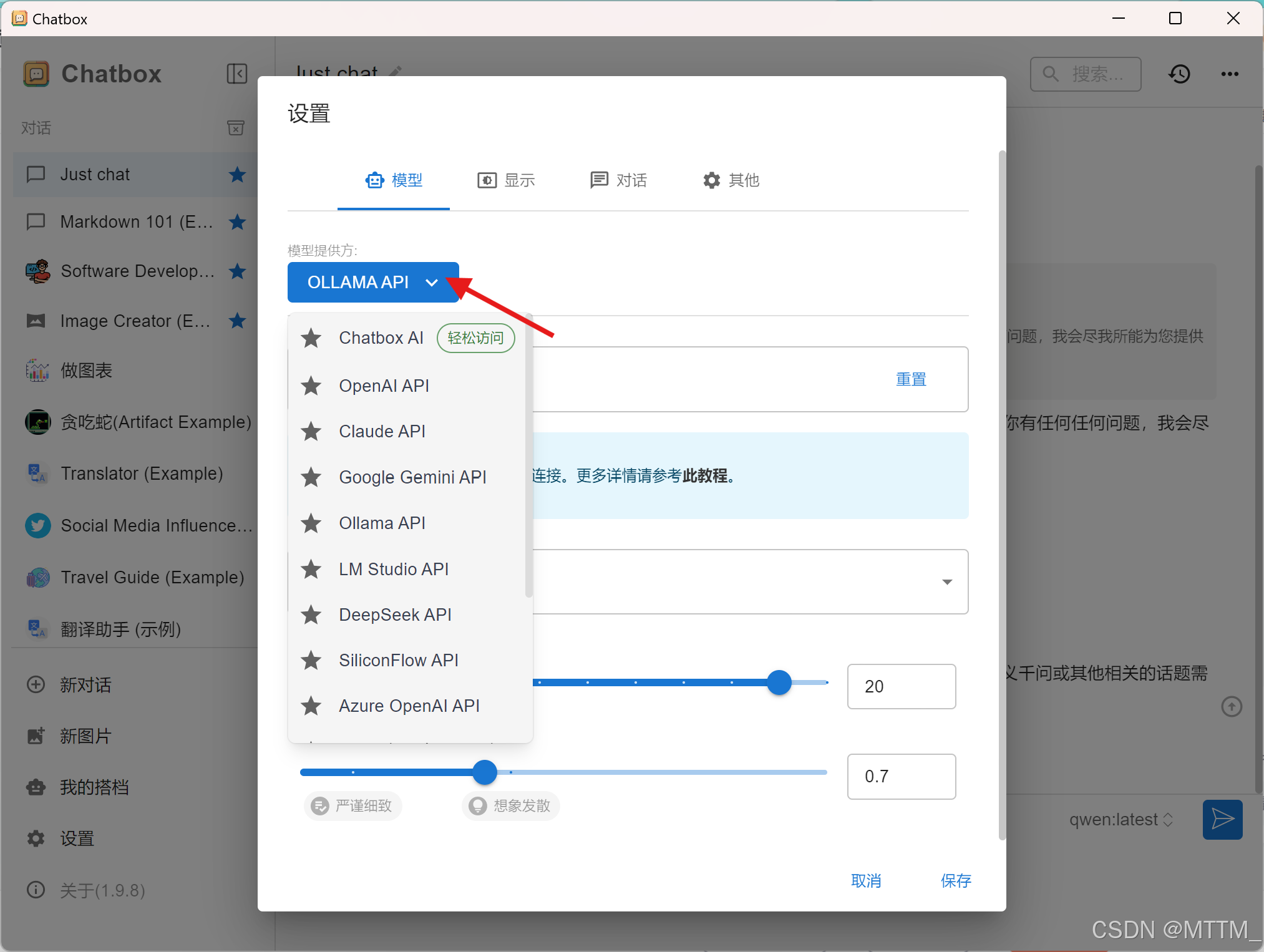 2、打开ChatBox后,选择使用本地模型
