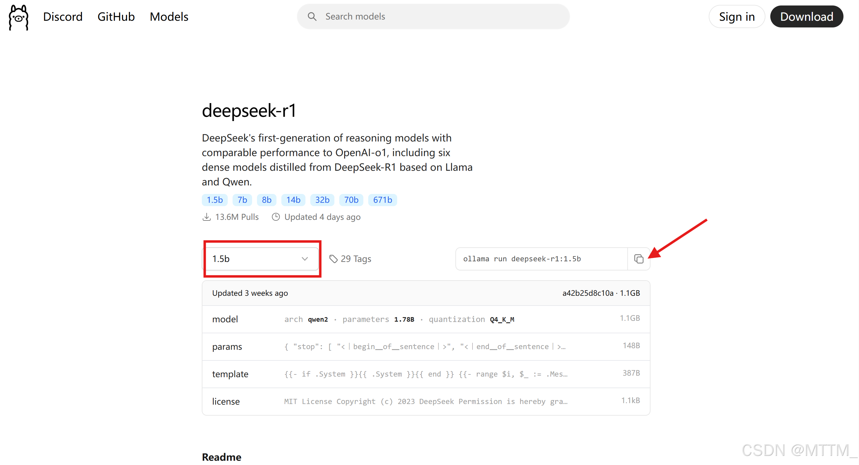 可以看到这里面有很多模型选择,点击红色框内可以选择不同的模型,这里我用的1.5b,然后点击箭头所指的位置的复制按钮复制运行该模型的命令。