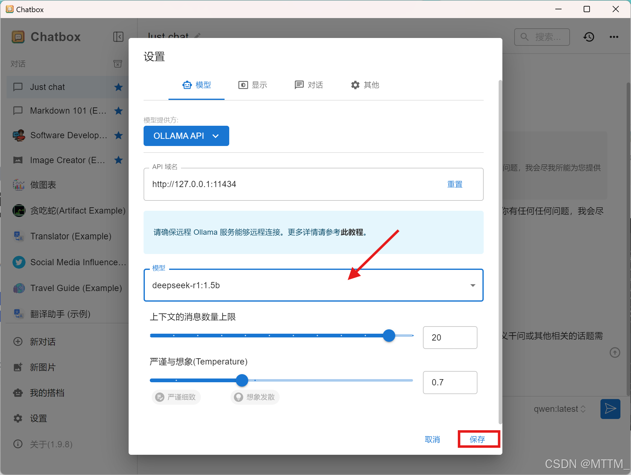 4、模型选择刚才下载好的模型,其他配置默认的就可以,直接点击保存